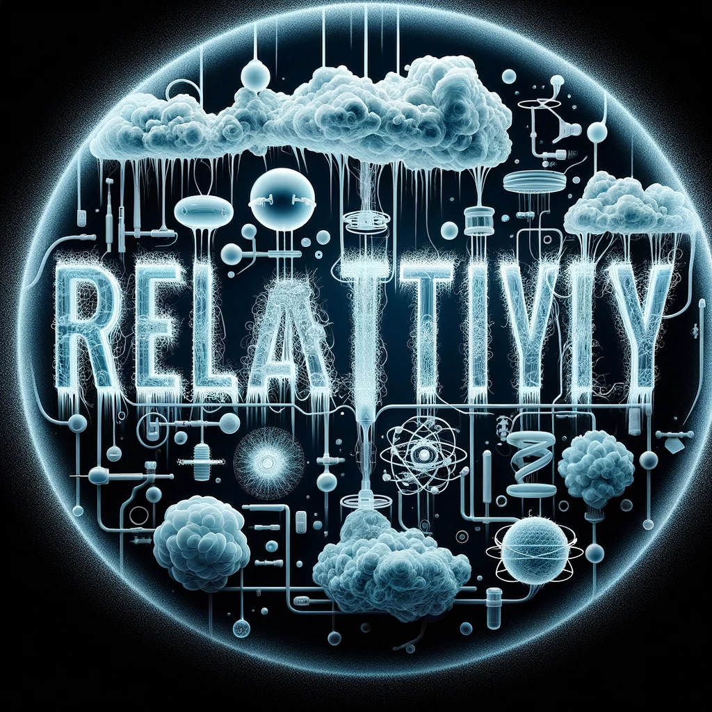 Here’s how the Kinetic Typography digital art piece featuring the word ‘RELATIVITY’, with electrons and clouds, might look through an X-ray machine. This X-ray effect offers a unique, translucent view, highlighting internal structures and creating an ethereal, ghostly image. The word ‘RELATIVITY’, along with the electrons and cloud formations, is visible in this X-ray style, providing a different perspective on the artwork.